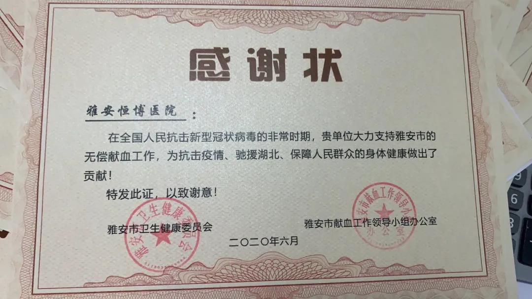 (雅安市中心血站頒發(fā)感謝狀)